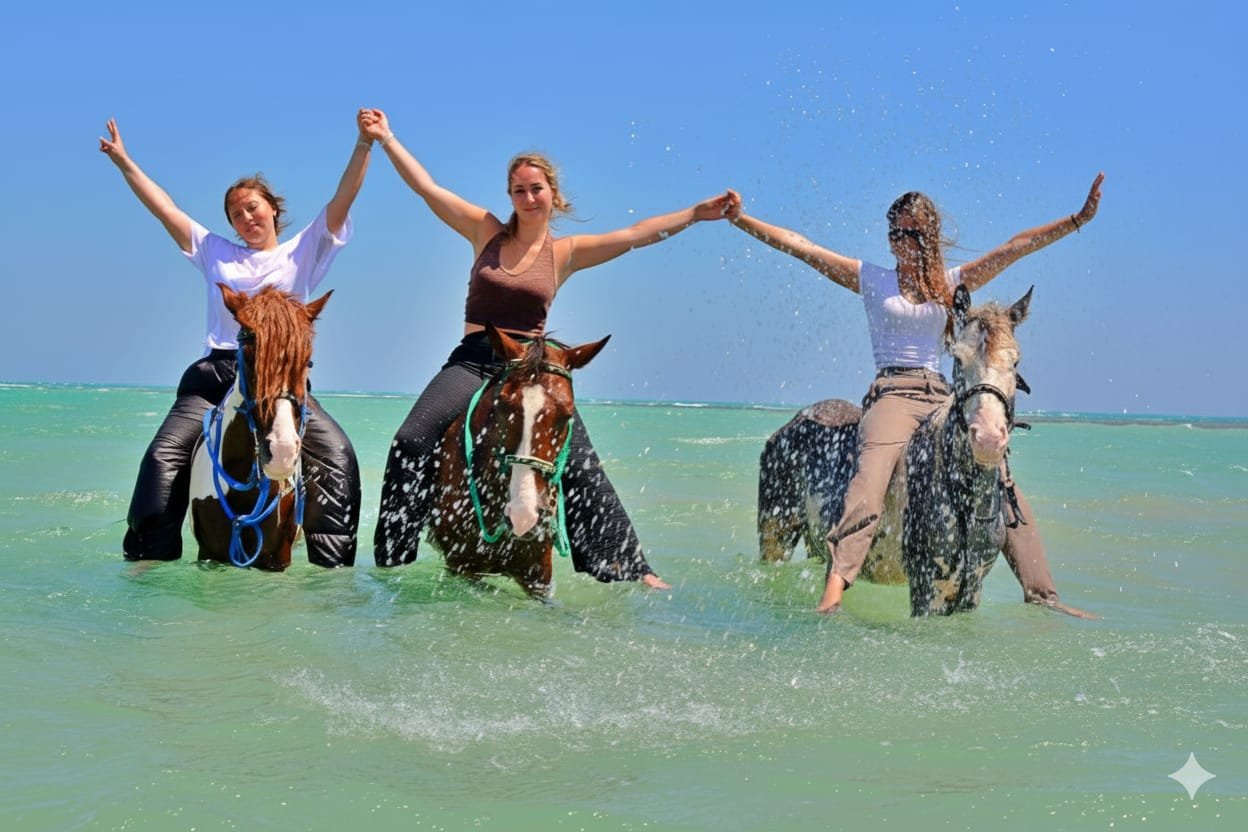 Experience one of Hurghada most exciting horse-riding adventures, combining desert riding, beach riding, and the unforgettable opportunity to swim with horses in the Red Sea.