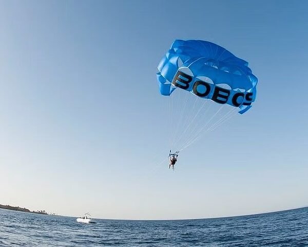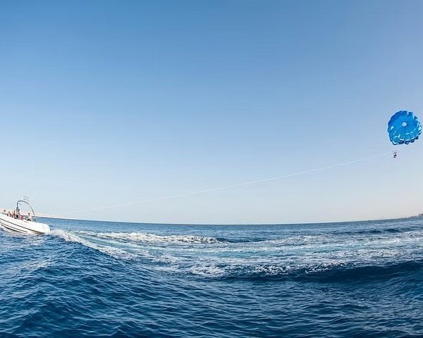 Enjoy a thrilling parasailing adventure over the crystal-clear waters of the Red Sea, with panoramic views of the coastline and islands in Hurghada. Experience 5 to 7 minutes of flight, soaring safely above the sea with a professional guide and speedboat support.